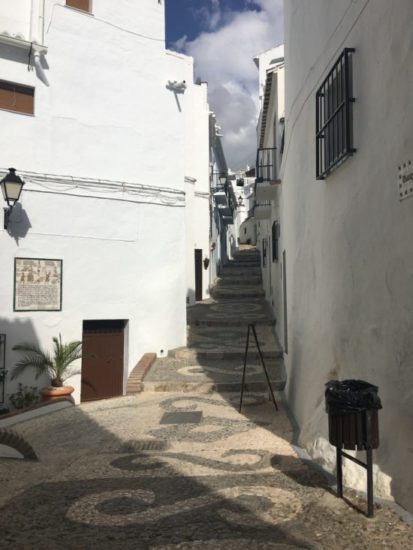 フリヒリアナは「スペインで1番綺麗な街」というのに選ばれた事がある、アンダルシアの白い村の1つです。標高320mの所にある、3000人ぐらいの人が暮らす村です。岩の切り立った山の上にあるために、街の中の道がとても狭く、ホテルの前の道も午前11時から午後2時までは観光客が多い為に侵入禁止になっているそうです。